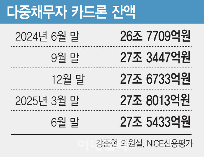 다중채무자 카드론은 지난 2022년말부터 작년 말까지 2년 동안 9.4%(2조 3781억원) 급증했다. 특히 지난해에만 1조 7992억원 늘어난 카드론은 올 3월말 27조 8013억원까지 불어났다가 2분기 중 2580억원 감소했다.