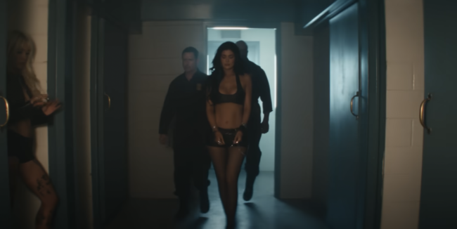 그는 검정 가죽 브라톱과 초미니 쇼츠, 어깨까지 내려오는 웨이브 헤어, 진한 스모키 메이크업으로 완벽히 꾸민 채 교도소 복도를 천천히 걸었다. 영상 말미에는 “King Kylie. Tomorrow”라는 문구가 등장하며, 그녀의 카리스마를 강조했다.