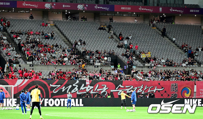 [OSEN=서울월드컵경기장, 지형준 기자]홍명보 감독이 이끄는 대한민국 대표팀과 파라과이의 A매치 평가전이 14일 오후 서울월드컵경기장에서 열렸다.'남미 강호' 파라과이는 지난 10일 일본 원정에서 2-2 무승부를 거두고 온 팀이다. 이번 경기는 홍명보호의 2026 북중미 월드컵 포트 배정을 두고도 중요한 일전이다.현재 한국은 오스트리아, 호주, 에콰도르와 치열한포트 2 막차 경쟁을 벌이고 있다.경기 개시 30분 정도 앞둔 시점에 관중석이 절반 가까이 비어 있다. 2025.10.14. /jpnews@osen.co.kr |