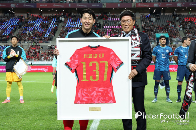 파라과이전을 앞두고 특별한 이벤트가 진행됐다. 차범근 전 감독이 경기장을 방문해 그라운드에서 손흥민에게 A매치 역대 최다 출전을 기념하는 유니폼을 전달한 것. 손흥민도 차범근 전 감독에게 고개를 숙이며 감사한 마음을 전했다.