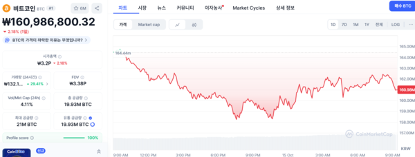 15일 글로벌 가상자산 시황중계 사이트 코인마켓캡에 따르면 오전 9시 기준 비트코인 가격은 24시간 전 대비 2.68% 하락한 1억6098만원을 기록했다. 일주일 전과 비교하면 6.72% 내렸다.