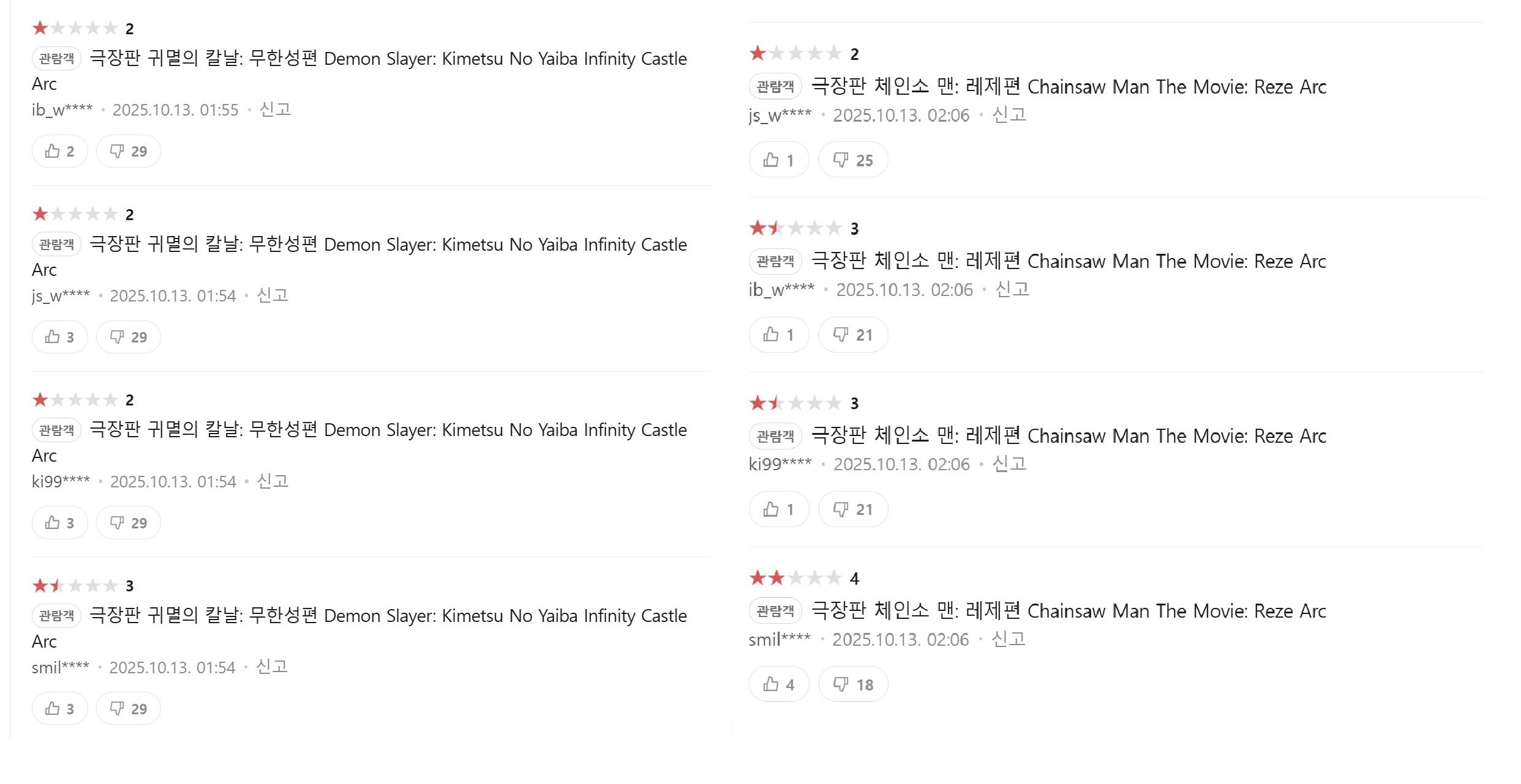 그런데 14일까지 541만명이 관람한 ‘극장판 귀멸의 칼날: 무한성편’과 14일까지 190만명이 관람한 ‘극장판 체인소맨: 레제편’의 실관람평에 지난 13일 오전 2시쯤 4개의 아이디로 작성된 ‘평점 테러’로 보이는 글이 잇따라 올라왔다. ‘귀멸의 칼날’에는 13일 오전 1시 54~55분에 평점 2~3점 글 4개가 올라왔는데, 리뷰에는 4개 모두 관람평 없이 해당 영화의 제목만 올라와 있다. 이 영화의 실관람객 평점은 9.02점이다.
