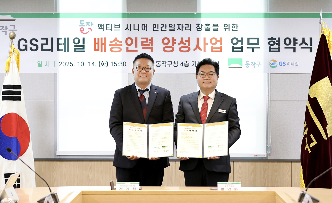 GS리테일은 지난 14일 서울 동작구청에서 동작구와 ‘도보 배송원 어르신 일자리 동행 사업’ 추진을 위한 업무협약(MOU)을 체결했다고 15일 밝혔다. 협약식(사진)에는 전진혁(왼쪽) GS리테일 O4O부문장, 박일하(오른쪽) 동작구청장 등 양측 관계자들이 참석했다.