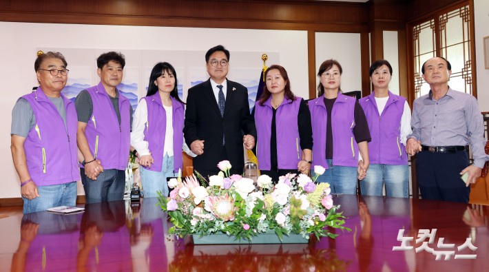 우원식 국회의장이 15일 오후 국회의장실에서 10.29이태원참사 유가족 면담에 앞서 기념촬영을 하고 있다.