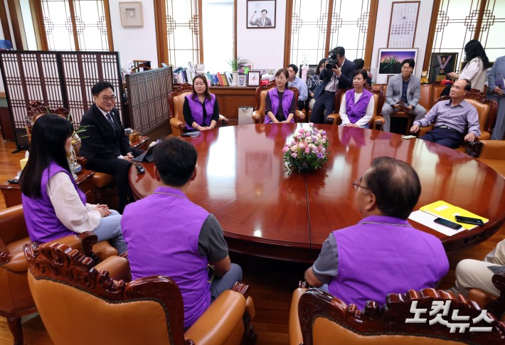 우원식 국회의장이 15일 오후 국회의장실에서 10.29이태원참사 유가족과 만나 대화하고 있다.