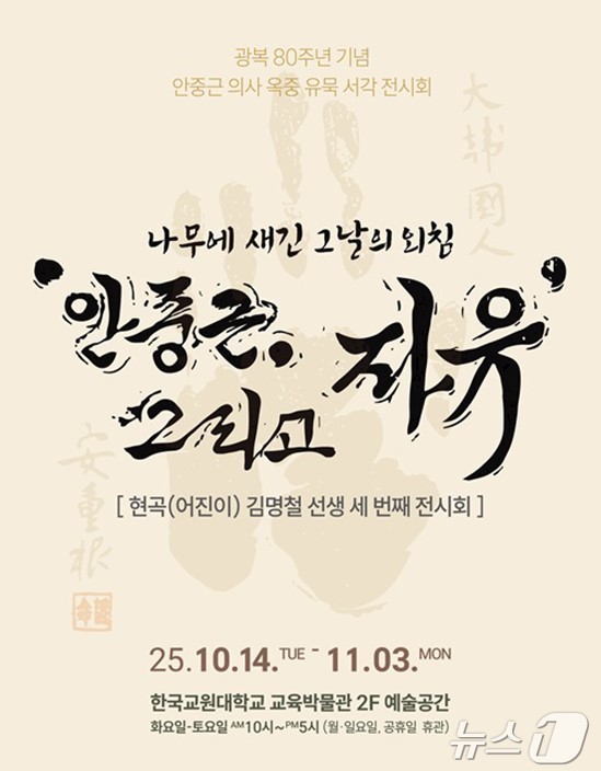 광복 80주년과 안중근 의사 순국 115주년 기념을 위한 전시로 안중근 의사의 옥중 유묵을 서각으로 재현한 현곡(어진이) 김명철 선생의 작품 등을 만날 수 있다.