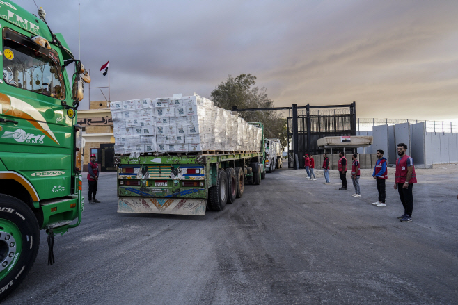 12일(현지시간) 인도주의적 구호 트럭이 이집트와 가자지구 사이의 라파 국경을 넘어 북시나이, 라파, 옥토베로 이동하고 있다./EPA 연합 |