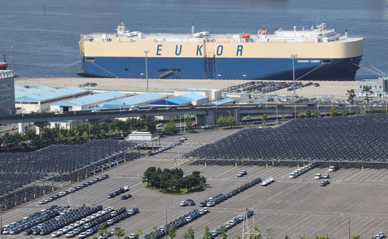 현대자동차 울산공장 수출선적부두 옆 야적장에 완성차가 대기하고 있다. 사진 연합뉴스 |