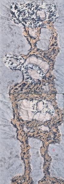 그의 화면은 조용하지만 강렬하다. 석체(石體) 분말을 여러 차례 쌓아올려 만들어낸 두터운 질감은 시간이 굳어 형체로 남은 듯 단단하며, 표면 아래엔 부서진 기억과 생명의 흔적이 교차한다. 석체는 광물성 분말을 안료처럼 녹여 사용한 재료로, 화면 위에 쌓이며 돌처럼 굳어가는 물질의 시간성을 상징한다. 그 재료는 ‘먹’의 무게를 품되 수묵의 번짐을 거부한다. 선과 곡선이 층층이 얽히며, 마치 땅속에서 생명이 몸을 틀고 다시 빛을 향해 솟아오르는 듯한 긴장감을 만들어낸다.