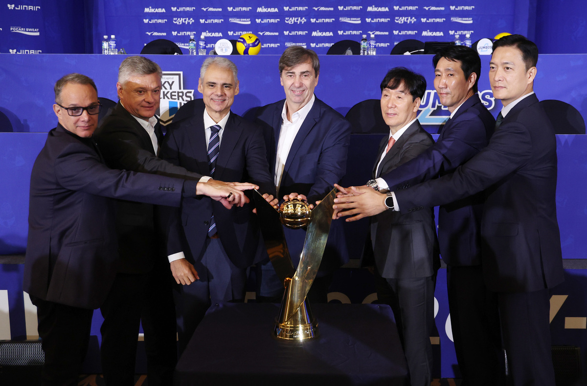 15일 서울 호텔리베라 청담에서 진에어 2025~2026 V리그 남자부 미디어데이가 열렸다. 마우리시오 파에스 우리카드 감독, 헤난 달 조토 대한항공 감독, 레오나르도 카르발류 KB손해보험 감독, 필립 블랑 현대캐피탈 감독, 신영철 OK저축은행 감독, 권영민 한국전력 감독, 김상우 삼성화재 감독(왼쪽부터)이 포즈를 취하고 있다. 사진=뉴시스 |