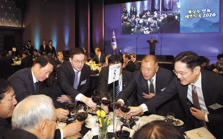 지난 2020년 당시 서울 중구 대한상공회의소에서 열린 정부 신년합동인사회에 참석한 최태원(왼쪽부터) SK그룹 회장, 구광모 LG그룹 회장, 정의선 현대자동차그룹 회장, 이재용 삼성전자 회장 [연합] |