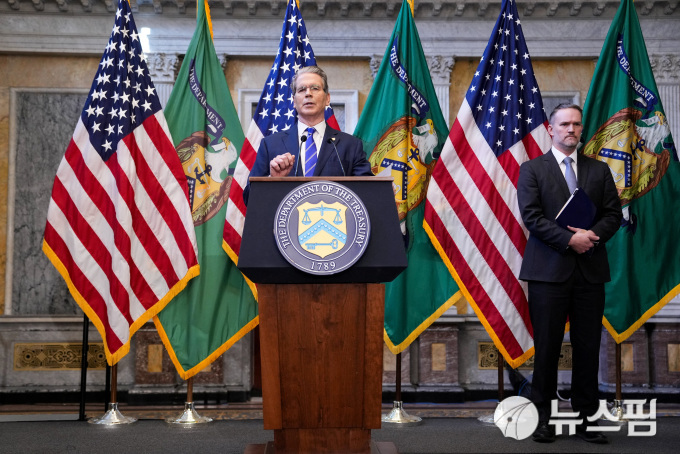 미국 재무장관 스콧 베센트 미국 재무장관과 제이미슨 그리어 미무역대표가 2025년 10월 15일 재무부 청사에서 합동 기자회견을 열었다. [사진=로이터 뉴스핌] |