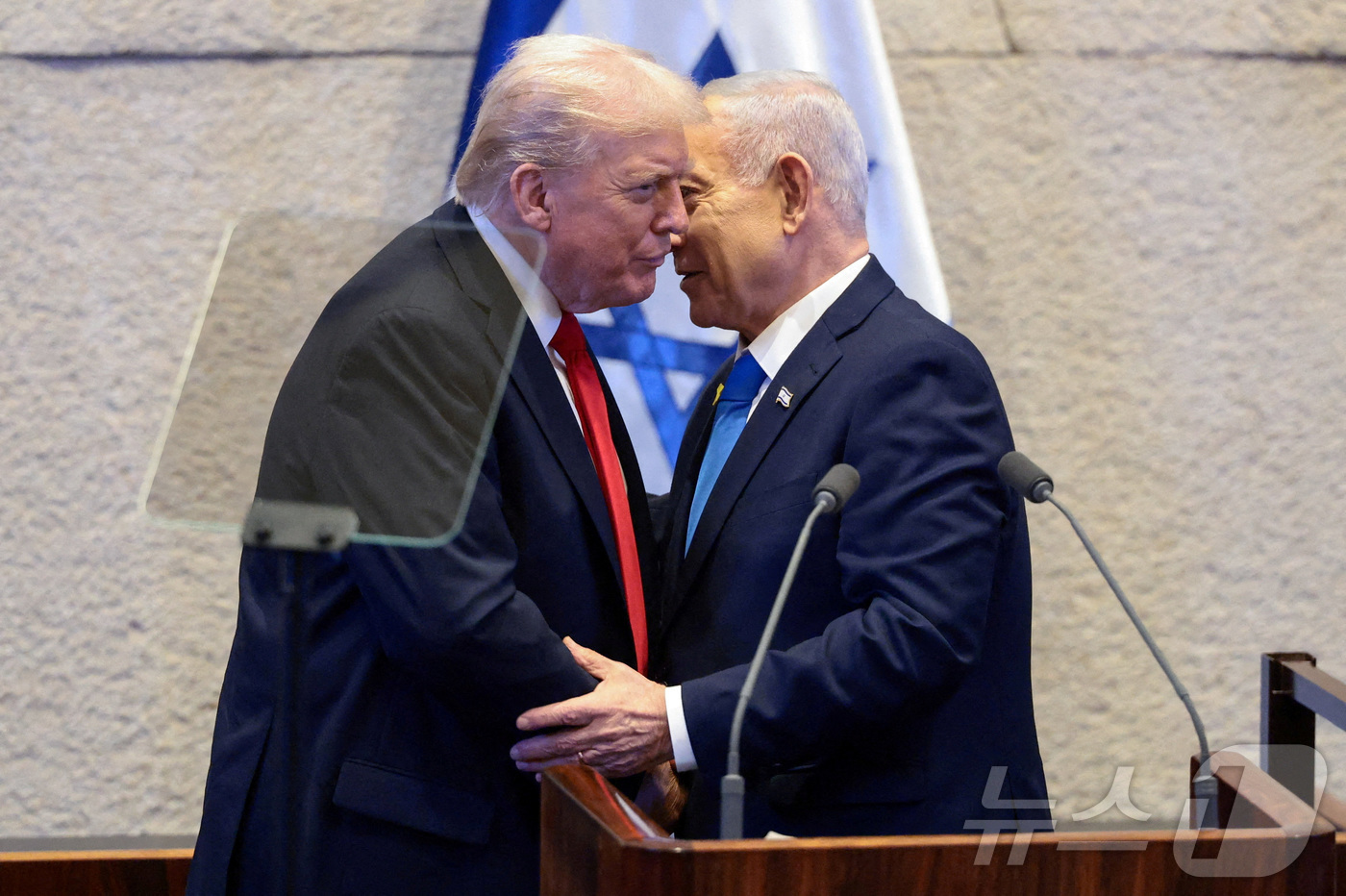 13일(현지시간) 도널드 트럼프 미국 대통령과 베냐민 네타냐후 이스라엘 총리가 트럼프 대통령의 연설이 예정된 크네세트(이스라엘 의회)에서 함께 서 있다. 이날 예루살렘에서는 미국이 중재한 이스라엘-하마스 간 포로 및 인질 교환과 휴전 합의가 이루어졌다. 2025.10.13. ⓒ 로이터=뉴스1 ⓒ News1 권영미 기자 |