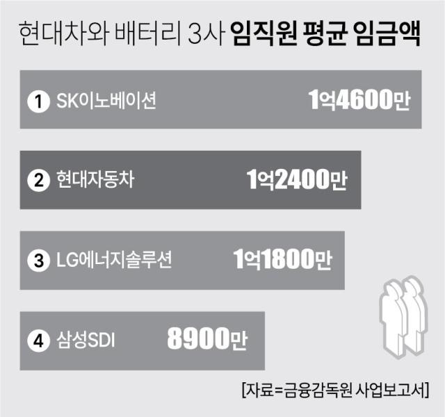 실제 현대차 직원 처우는 배터리 업계 보다 좋은 편이다. 금융감독원에 전자공시시스템에 제출된 각 사 사업보고서에 따르면 지난해 현대차 임직원 1인당 평균 연봉은 1억2400만원으로 LG에너지솔루션(1억1800만원)보다 5.1% 높고, 삼성SDI(에너지부분·8900만원)보다 39.3% 높다. 배터리 3사 가운데서는 유일하게 SK이노베이션(1억4600만원)만 현대차보다 높다.
