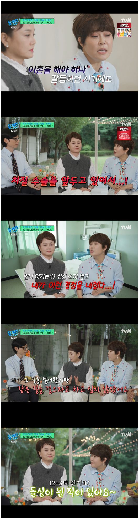 이경실은 “‘여걸파이브’는 내가 이혼했을 때라, 그랬다. 콘셉트가 참 남자에게 들이대야 하는 거였는데 조혜련이 대신 많이 나서줬다”라고 말했다. 그러자 조혜련은 “사실 이혼할지 갈등을 했을 때, 이경실이 엄청나게 잔소리를 해서 거리를 뒀을 때가 있었다. 사실 잔소리가 계속 들으면 듣기 싫지 않냐”라면서 “하필 그때 치질 수술을 앞두고 입원을 했다. 조치를 취한다고 해도 수술을 피할 수 없었다. 피할 수가 없었다. 그래서 이경실이 수술 전날 병원에 와 줬다”라고 말했다.