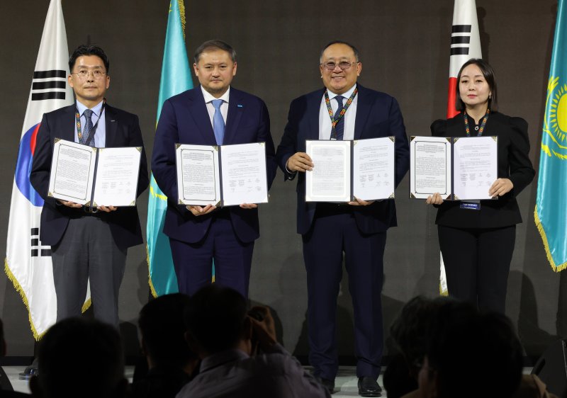 카자흐스탄 알라타우 시티 국제 로드쇼가 열린 15일 오전 서울 중구 롯데호텔에서 참석자들이 G2G & G2B MOU 기념촬영을 하고 있다. 사진=뉴시스 |