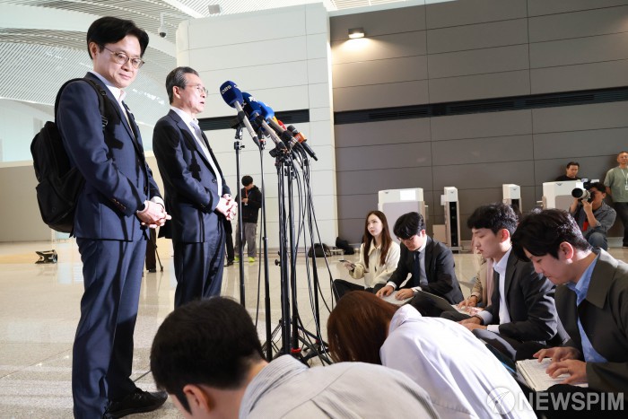 [영종도=뉴스핌] 김학선 기자 = 김용범 대통령실 정책실장(오른쪽)과 김정관 산업통상자원부 장관이 16일 한미 관세 협상 후속 협의를 위해 인천국제공항을 통해 미국으로 출국하며 취재진의 질문에 답하고 있다. 2025.10.16 yooksa@newspim.com