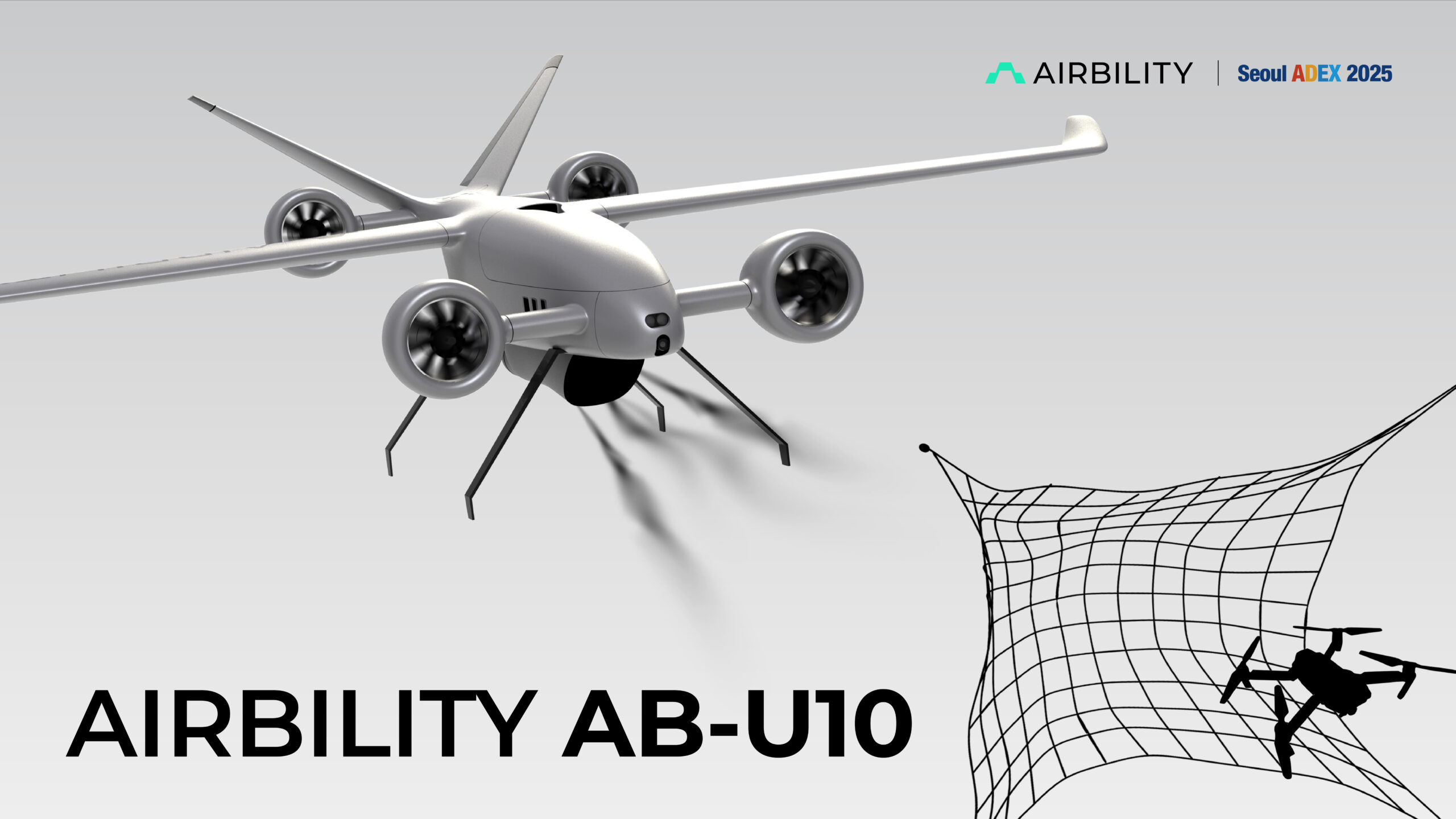 에어빌리티는 전시회 기간 동안 독립부스와 신기술관 두 곳에서 자사의 항공 모빌리티 비전과 기술을 소개할 예정이다. 독립부스에서는 1.8미터급 무인기 ‘AB-U10’을 처음으로 일반에 공개한다. AB-U10은 고정익 기반의 수직이착륙 틸트 추진 시스템을 갖춘 전술형 소형 무인기로, 신속한 근거리 정찰과 드론 위협 대응용으로 설계됐다. 해당 무인기는 고속 비행과 그물망(Net-Gun) 포획 방식을 활용해 적 드론을 무력화하면서 2차 피해를 최소화하는 물리적 대드론(c-UAS) 솔루션을 제공한다.