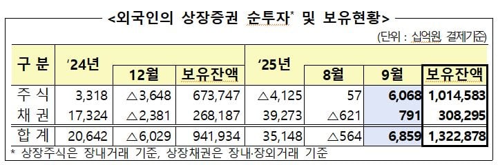 금융감독원은 16일 ‘2025년 9월 외국인 증권투자 동향’을 발표하고 지난달 외국인의 국내 자본시장 순 투자 규모가 6조8590억원을 기록했다고 밝혔다.