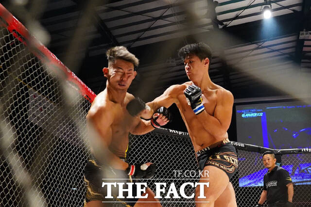 KMMA에서 미들급 챔피언을 지낸 권지후(24)가 지난달 일본 오사카 글래디에이터 032에서 고토 타케스에의 종합격투기 5연승을 저지하고 있다. /뽀빠이연합의원 |