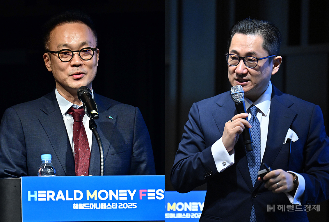 미 증시 전문가로 꼽히는 유동원 유안타증권 글로벌자산배분 본부장과 국내 대표 애널리스트 이재만 하나증권 리서치센터 글로벌투자분석실장이 16일 서울 강남구 코엑스 그랜드볼룸에서 개최한 ‘헤럴드머니페스타 2025’에서 각각 ‘글로벌 투자 키워드는 생산성’, ‘주식시장 전망과 전략-금리로 시작해서 실적으로 끝납니다’을 주제로 강연에 나섰다.