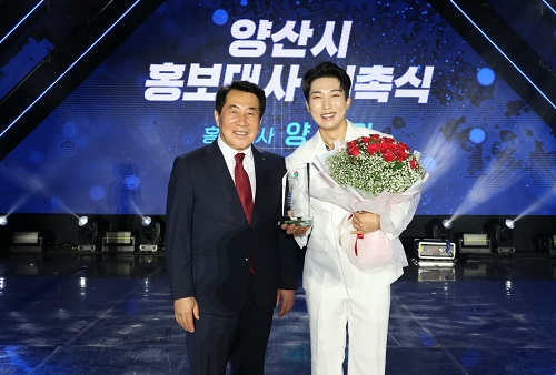 양지원은 ‘2025 양산삽량문화제’ 개막식 무대에서 4천여 명의 양산시민 앞에서 나동연 양산시장으로부터 홍보대사 위촉장을 수여받았다. |
