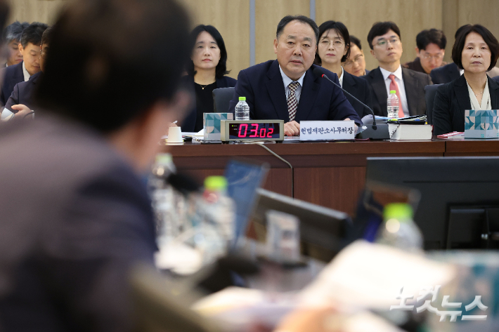 손인혁 헌법재판소 사무처장이 17일 서울 종로구 헌법재판소에서 열린 헌법재판소 등에 대한 법제사법위원회 국정감사에서 의원질의에 답하고 있다. 류영주 기자 |