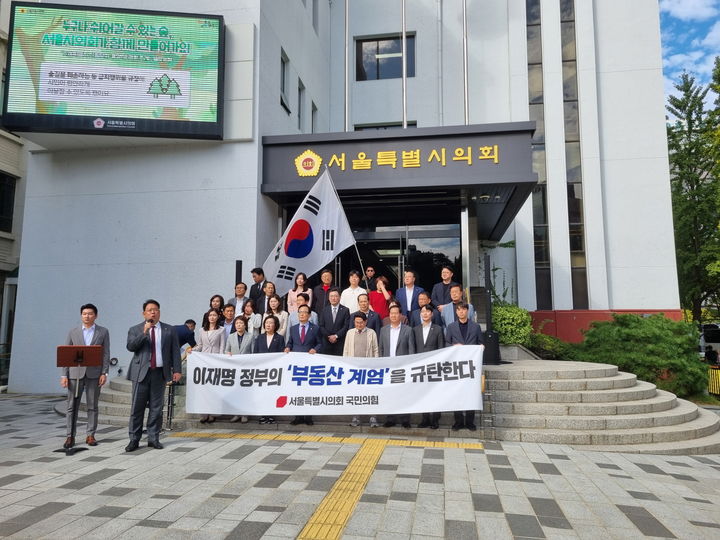 시의회 국민의힘 의원 30여명은 17일 오후 시의회 본관 앞에서 규탄 대회를 열고 "지난 15일 이재명 정부의 국토부는 서울시의 반대에도 불구하고 서울 전 지역을 투기과열 지구 및 토지거래허가 구역으로 결박하는 전례 없는 만행을 저질렀다"고 주장했다.