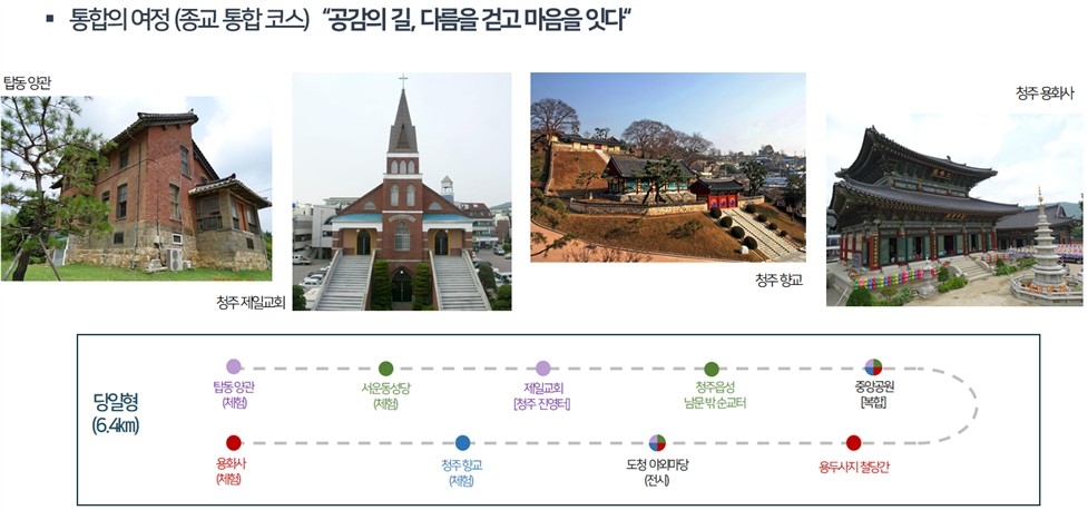 ‘공감의 길’은 청주 원도심에 있는 성당, 사찰, 교회, 향교 등을 잇는 6.4km의 도보 탐방로다. 반나절이면 충분히 걸을 수 있는 코스다. 탑동 양관을 시작으로 서운동성당, 제일교회, 청주향교, 용화사 등을 거치며 다양한 종교 문화를 경험할 수 있도록 설계됐다.