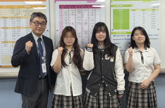 마이다스 그룹 고졸 인턴십에 합격한 대구SW마이스터고 학생3명이 한석민 교장직무대리와 화이팅을 외치고 있다. |