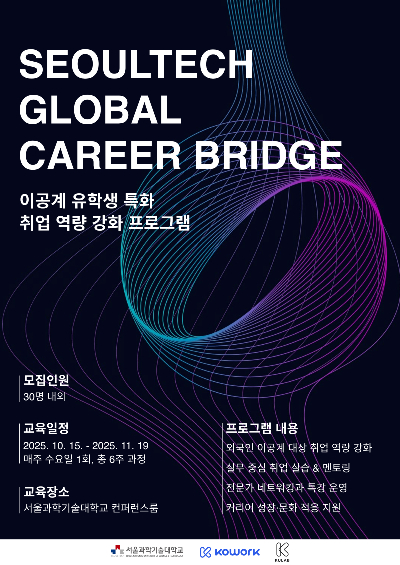 외국인 채용 플랫폼 코워크(KOWORK) 운영사 코워크위더스(대표 김진영)가 서울과학기술대학교와 함께 이공계 외국인 석·박사생을 위한 취업역량 강화 프로그램 '글로벌 커리어 브릿지'(Global Career Bridge)를 운영한다고 17일 밝혔다.