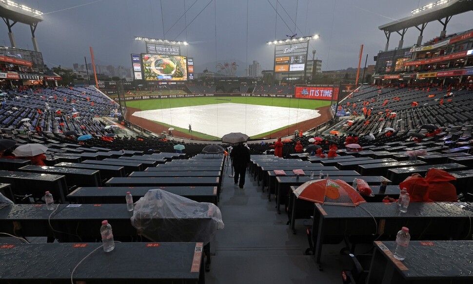 삼성 라이온즈와 한화 이글스의 2025 KBO리그 플레이오프(PO) 1차전이 열리는 17일 대전 한화생명 볼파크에 비가 내리고 있다. 연합뉴스 |