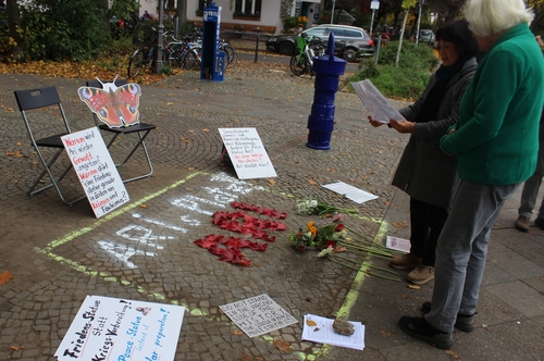17일(현지시간) 베를린 평화의 소녀상이 철거된 자리에 항의 팻말이 놓여 있다. |