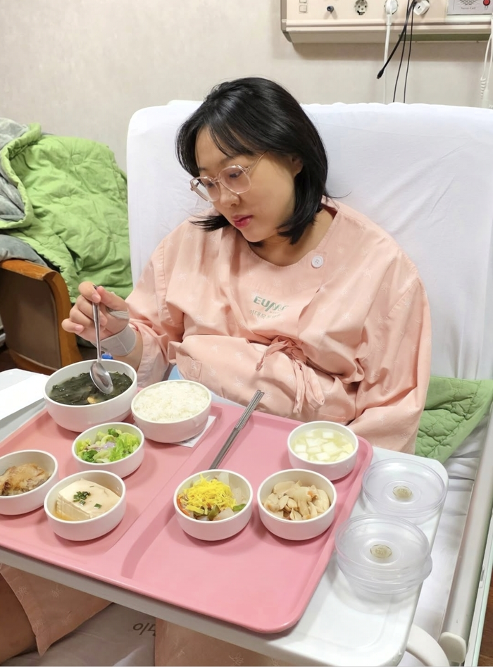 17일 임라라는 자신의 SNS에 병원에서 식사하는 모습을 공개했다. 사진 속 임라라는 질린다는 표정으로 숟가락으로 미역국을 뜨고 있다.