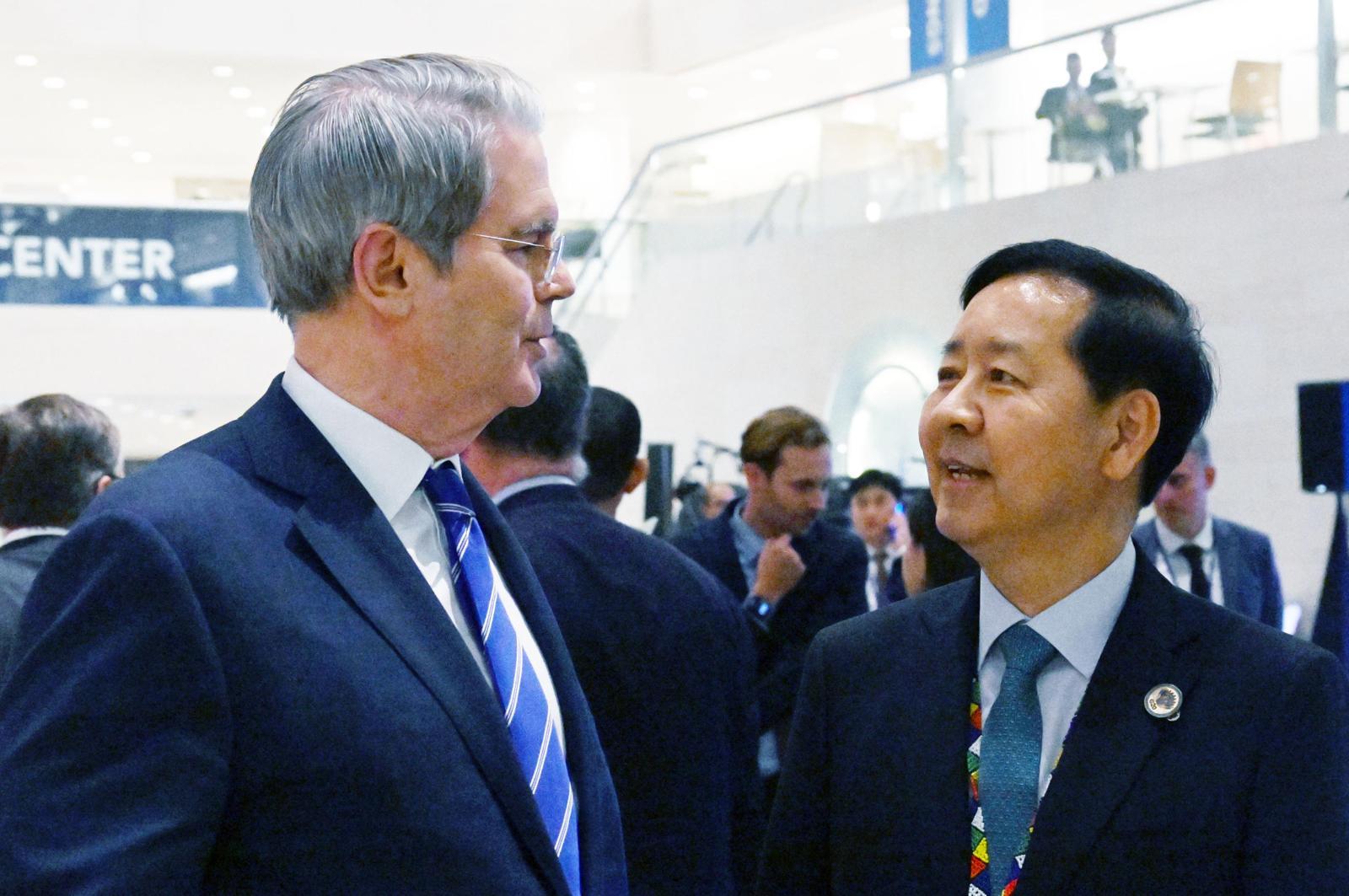 구윤철 부총리 겸 기획재정부 장관(오른쪽)이 15일(현지 시간) 미국 워싱턴 국제통화기금(IMF)에서 열린 주요 20개국(G20) 재무장관·중앙은행총재 회의에 참석해 스콧 베선트 미 재무장관과 대화를 나누고 있다. 구 부총리는 베선트 장관에게 대미 투자 선불 요구가 한국 외환시장 안정성을 해칠 수 있다는 우려를 전달했다. 기획재정부 제공 |