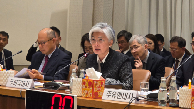 강경화 주미대사가 17일(현지시간) 미국 뉴욕 맨해튼 주유엔한국대표부에서 열린 국회 외교통일위원회 국정감사에서 의원들의 질의에 답하고 있다. /사진=심재현 특파원 |