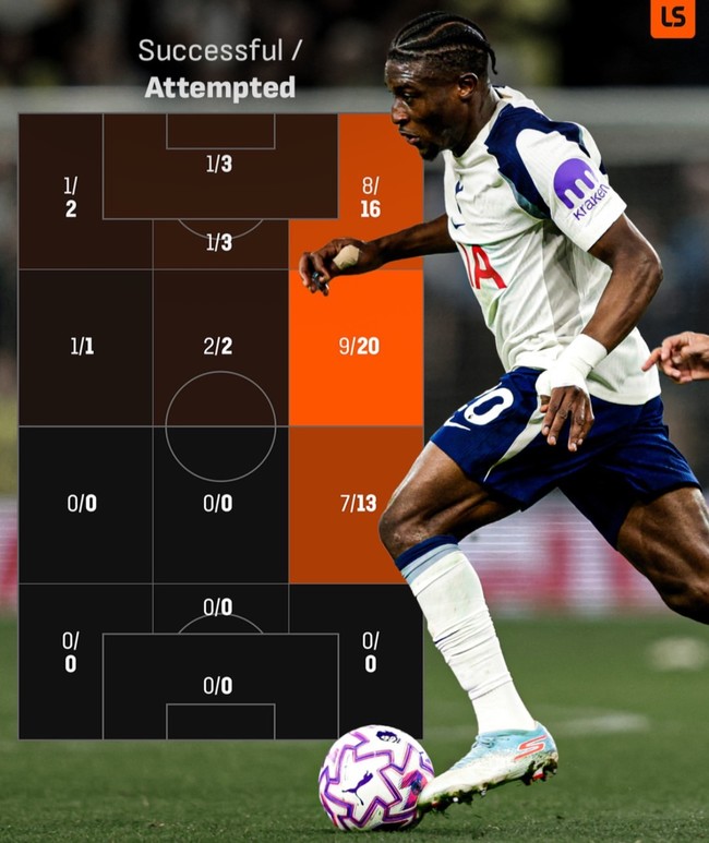 유럽 5대리그 드리블 성공 30회로 1위다. 시도 56회 중 성공이 30회다. 상세하게 보면 우측에서 높은 성공 숫자를 자랑한다. '라이브 스코어'는 "쿠두스가 뛰는 건 레프트백에 공포다"고 표현했다. 이처럼 쿠두스는 프리미어리그 7경기에서 1골 4도움을 올리고 있는데 드리블 능력을 확실히 보여주면서 경기내용도 만족스럽다. 토트넘의 새로운 에이스로 지목되고 있다.