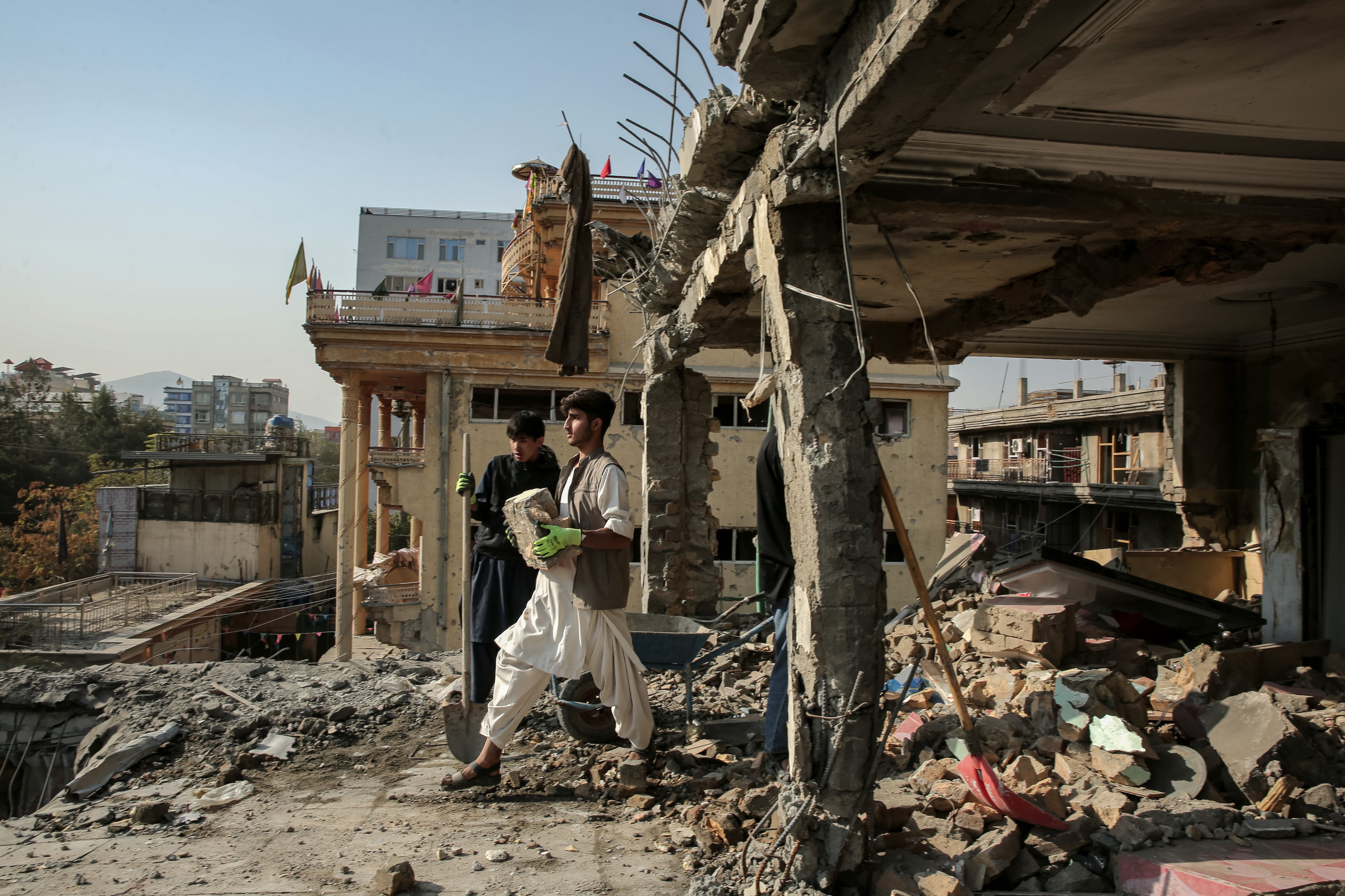 지난 16일 아프가니스탄 수도 카불에서 작업자들이 파키스탄의 공습으로 파괴된 한 학교 인근 건물을 살펴보고 있다./EPA 연합뉴스 |