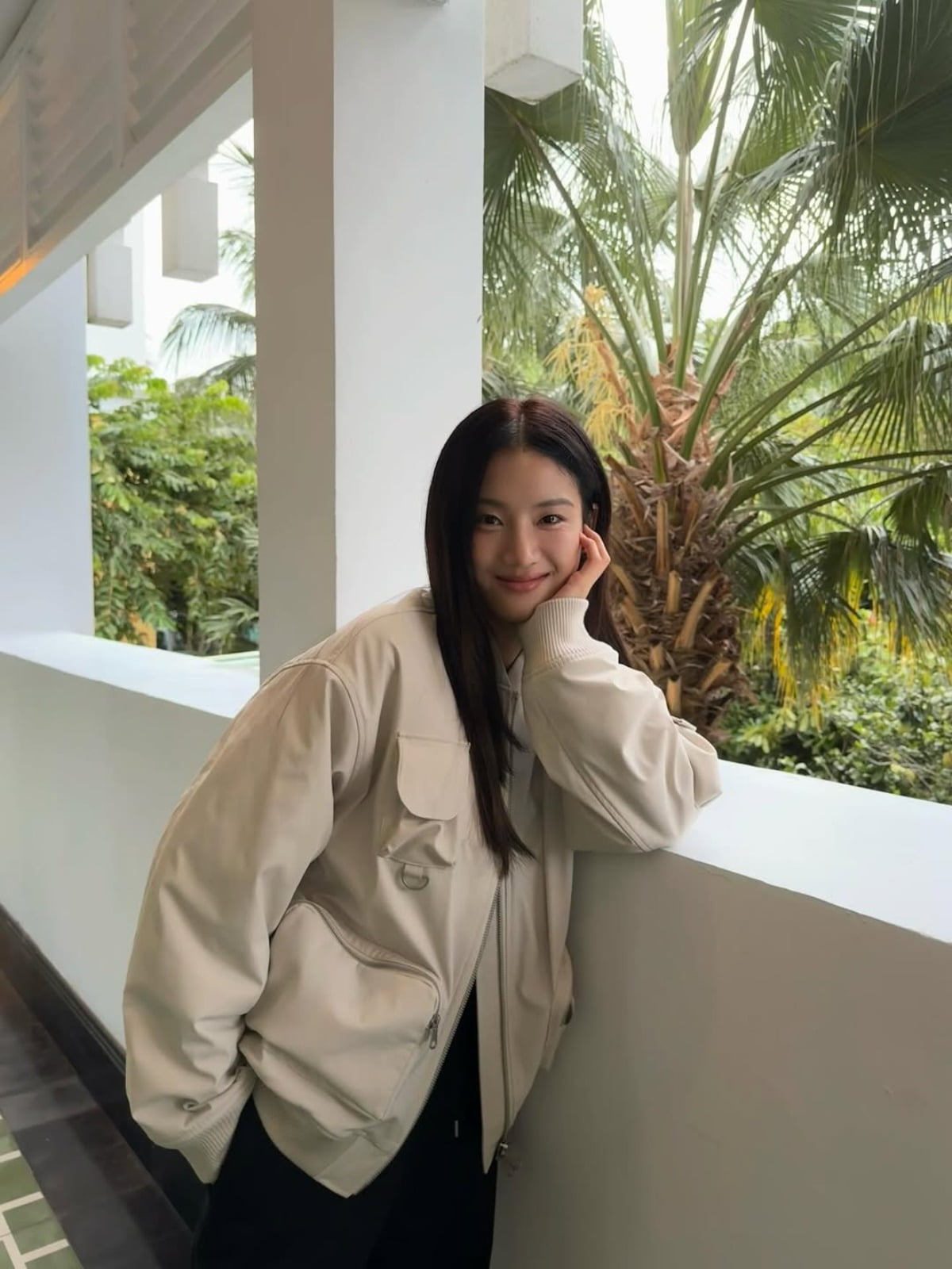 사진에서 박주현은 야외 난간이 있는 공간에서 포즈를 취하고 있다. 박주현은 크림색 오버핏 항공 점퍼를 살짝 걸치고 블랙 크롭톱을 매치하여 탄탄한 복근과 잘록한 허리 라인을 시원하게 드러냈다. 하의는 블랙 조거 팬츠와 부츠를 착용해 편안하면서도 스타일리시한 '꾸안꾸' 믹스매치 룩을 완성했다. 환하게 웃거나 한쪽 턱에 손을 괴고 살짝 미소 짓는 등 자연스럽고 발랄한 표정은 박주현 특유의 싱그러운 매력을 더한다. 특히 초록색 야자수와 흰색 난간이 어우러진 배경이 시원한 분위기를 연출한다.