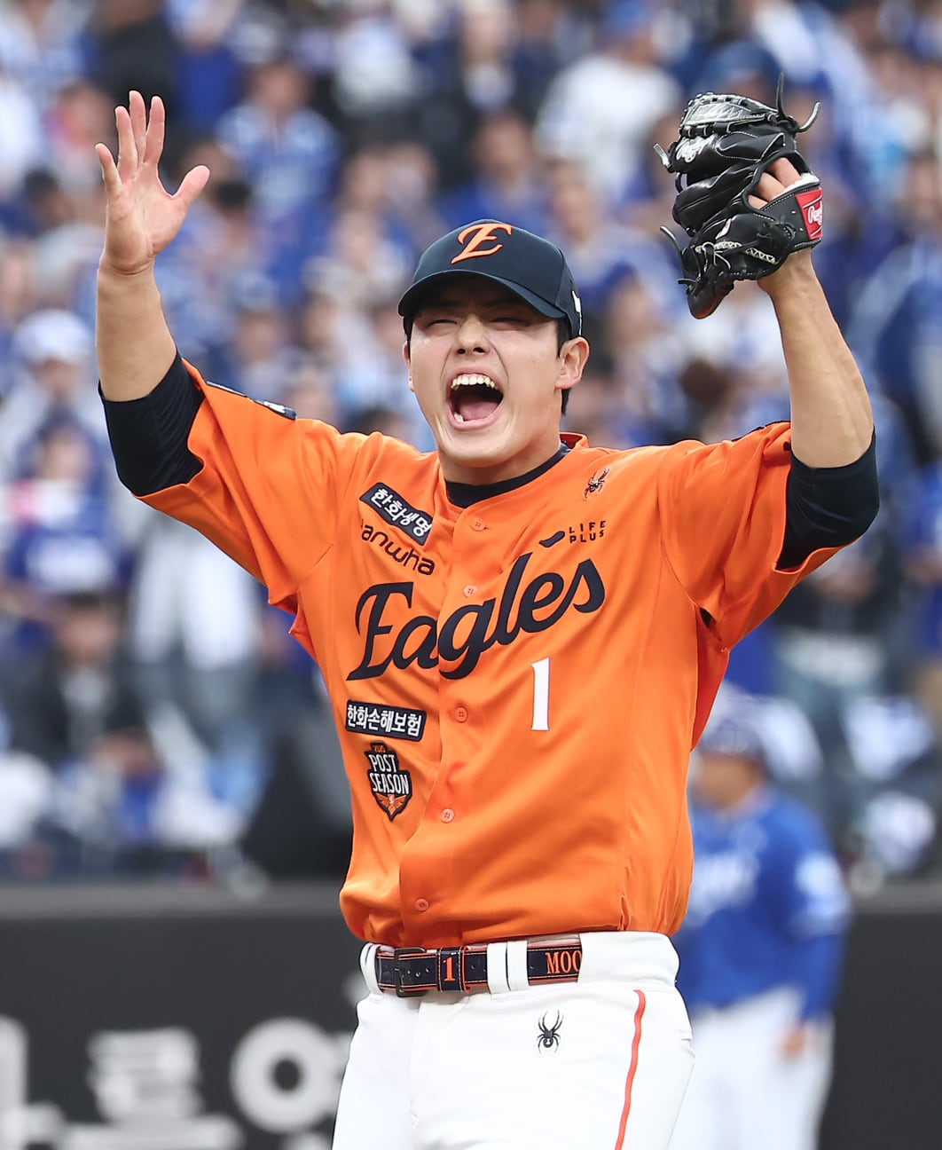 18일 대전 한화생명볼파크 열린 프로야구 2025 신한 SOL뱅크 KBO 플레이오프 1차전 삼성 라이온즈와 한화 이글스의 경기, 한화 문동주가 7회초 수비를 삼자범퇴로 막아낸 후 더그아웃을 향하며 포효하고 있다. /뉴스1 |