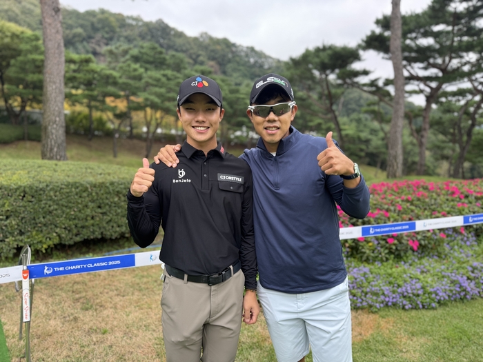 더 채리티 클래식에서 KPGA 투어 첫 우승에 도전하는 송민혁이 캐디로 함께 하는 이재혁 스윙코치와 함께 포즈를 취하고 있다. 임정우 기자 |