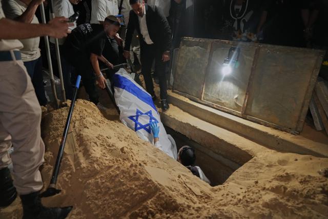 16일 이스라엘 홀론의 바트얌 묘지에서 친인척들이 하마스가 반환한 이스라엘 인질 에이탄 레비의 시신을 매장하고 있다. 홀론=AP 뉴시스 |