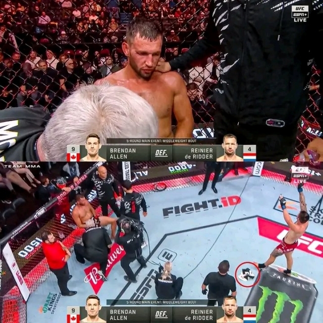 레이니어 더 리더는 19일(한국시간) 캐나다 브리티시컬럼비아주 밴쿠버 로저스 아레나에서 열린 브렌던 앨런과의 UFC 파이트 나이트 메인 이벤트 미들급 매치에서 4라운드 이후 코너 스탑, TKO 패배했다. 사진=X |