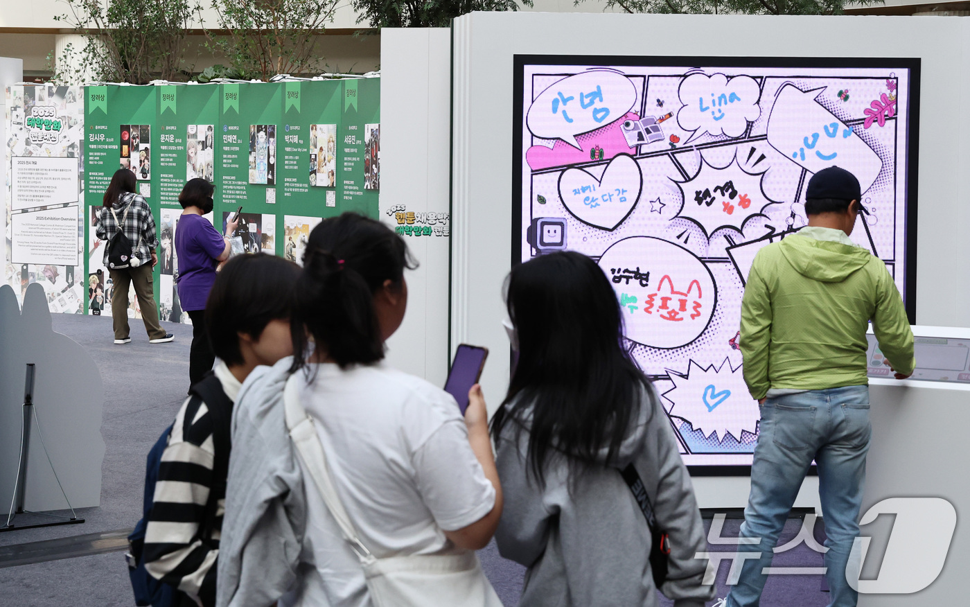 (서울=뉴스1) 구윤성 기자 = 19일 오후 서울 송파구 롯데월드 아이스링크에 마련된 '2025 월드 웹툰 페스티벌' 행사장에서 관람객들이 웹툰 전시를 둘러보고 있다. 오는 22일까지 롯데월드몰 일대에서 열리는 이번 행사는 웹툰 기업이 참여하는 팝업스토어와 전시, 토크콘서트와 상영회 등 다양한 프로그램이 마련됐다. 2025.10.19/뉴스1