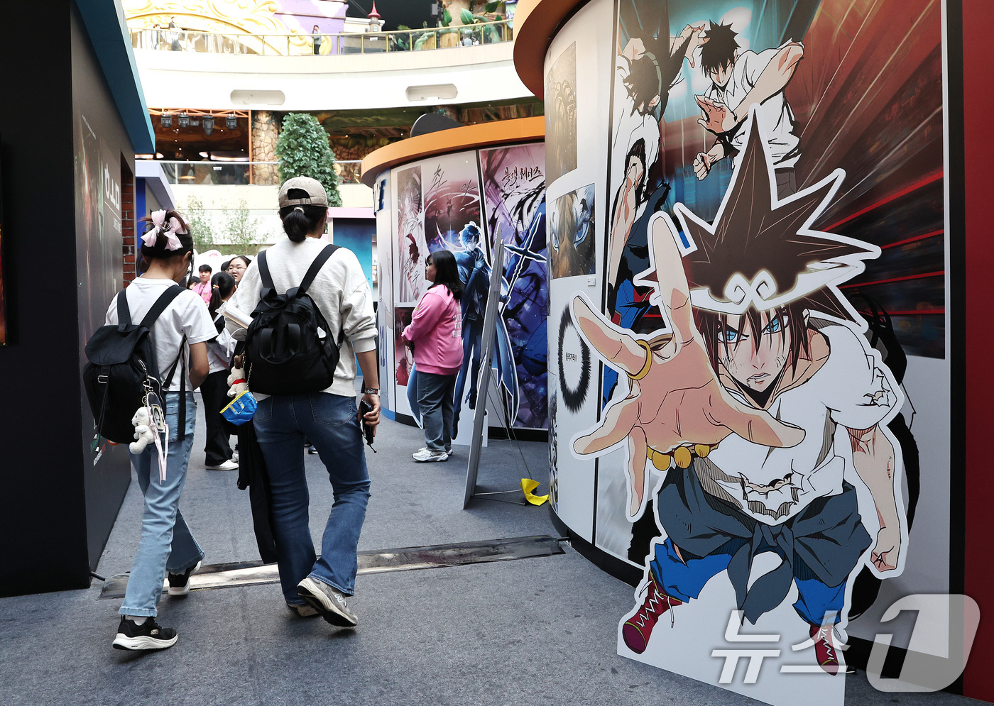 (서울=뉴스1) 구윤성 기자 = 19일 오후 서울 송파구 롯데월드 아이스링크에 마련된 '2025 월드 웹툰 페스티벌' 행사장에서 관람객들이 웹툰 전시를 둘러보고 있다. 오는 22일까지 롯데월드몰 일대에서 열리는 이번 행사는 웹툰 기업이 참여하는 팝업스토어와 전시, 토크콘서트와 상영회 등 다양한 프로그램이 마련됐다. 2025.10.19/뉴스1