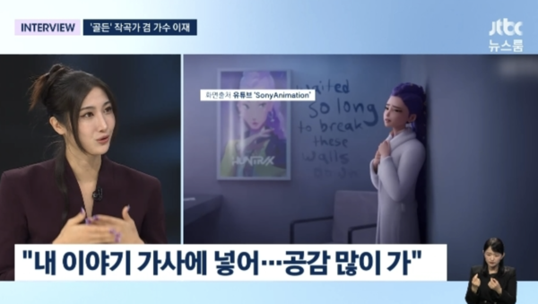 19일 방송된 JTBC '뉴스룸' 초대석에는 넷플릭스 애니메이션 영화 '케이팝 데몬 헌터스'(이하 '케데헌') OST '골든'(Golden)의 작곡가 이재가 게스트로 출연했다. 이재는 '골든'을 직접 부르기도 했다.