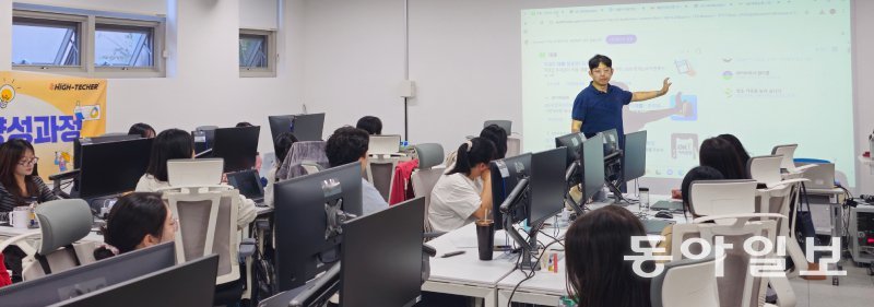 15일 오전 10시 서울 구로구에 위치한 청년취업사관학교 구로캠퍼스 지하 1층 강의실에서 강사가 인공지능을 활용한 마케팅을 주제로 강의하고 있다. 이날 이곳에는 취업준비생 28명이 참여해 마케팅 분야 진출을 위한 준비에 나섰다. 서울 청년취업사관학교의 24번째 캠퍼스인 구로캠퍼스는 이달 13일 개관해 취업준비생 60명을 대상으로 운영되고 있다. 임재혁 기자 heok@donga.com |