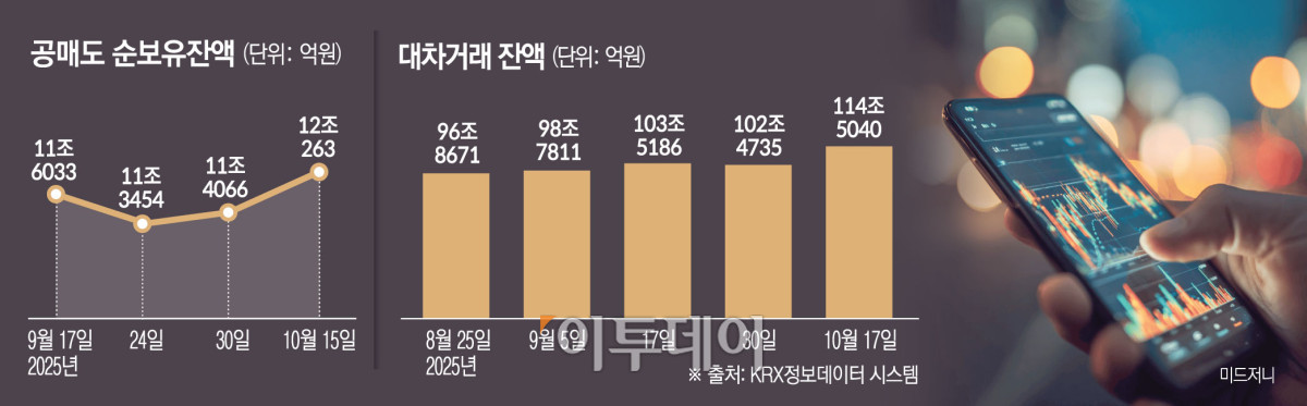 19일 한국거래소에 따르면 15일 기준 코스피 공매도 순보유 잔액은 12조263억 원으로 연중 최고치를 경신했다. 한 달 새 5000억 원 넘게 불었고, 3월 전면 재개 당시(3조9155억 원)와 비교하면 세 배 이상 급증했다. 올해 들어 공매도 잔액은 △6월 6조8000억 원 △7월 8조6000억 원 △8월 9조8000억 원을 거쳐 10월 들어 12조 원을 돌파했다. 불과 넉 달 만에 두 배 가까이 폭증한 셈이다. 전문가들은 “지속적인 상승이 오히려 부담으로 작용하며 시장 피로감이 누적되고 있다”고 지적한다.
