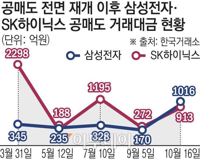 19일 한국거래소에 따르면 16일 기준 삼성전자 공매도 거래대금은 1016억 원으로 집계됐다. 이달 초 143억 원에서 7배가량 늘었다. 같은 기간 SK하이닉스 공매도 거래대금도 275억 원에서 913억 원으로 약 3.3배 불었다.