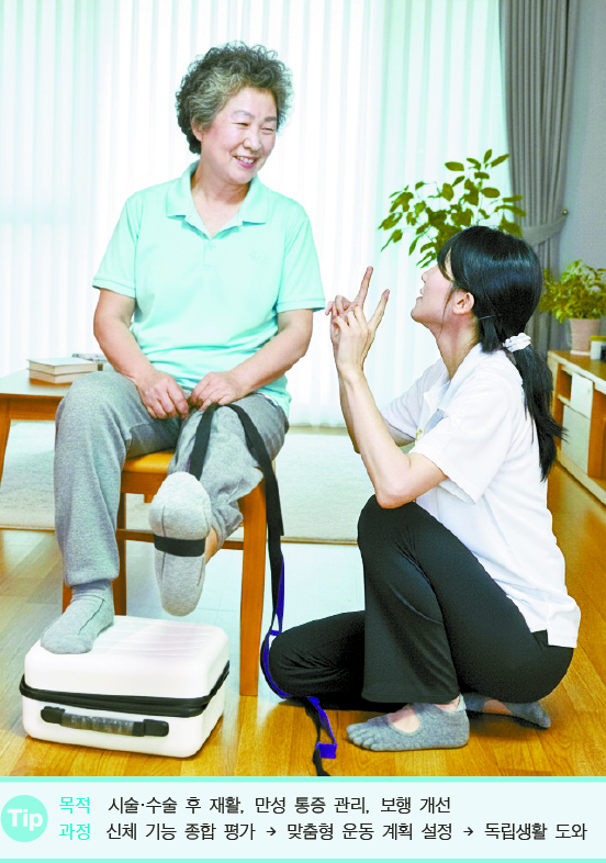 방문 재활 운동은 이들에게 좋은 대안이 될 수 있다. 5대 노년 증후군을 비롯해 시술·수술 후 외부 활동이 어려운 노년층, 중장년층을 대상으로 전문 트레이너가 직접 가정에 방문해 맞춤형 운동을 제공하는 프로그램이다. 제일정형외과병원 협력사인 시니어 건강관리 전문업체 제일리핏케어가 방문 재활 운동을 운영 중이다.